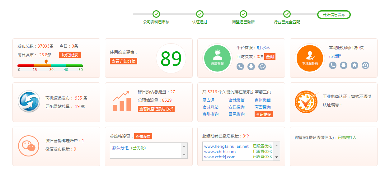 易管家實現監測管理分析數據,每周數據分析報告反饋,即時掌握商機發布情況,這是在發布行業未有的數據監測技術。監控易站通發布商機數量、搜索引擎收錄率、流量分析等,其中最關注的就是搜索引擎收錄率的展示,易管家會爬取商盟會員和商盟聯播、商機速遞的百度、360、搜狗、移動百度搜索引擎收錄率,以7天一個周期,2-3天更新一次數據,展示搜索引擎收錄情況針對未收錄的信息參考標準值進行優化、刷新,進一步提高收錄率。使用一周后,易管家每周會定期發送“易管家周報”郵件給用戶,周報會反饋用戶易站通一周使用情況,建議其如何優化改善、提升效果